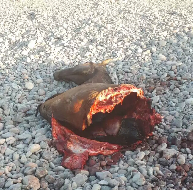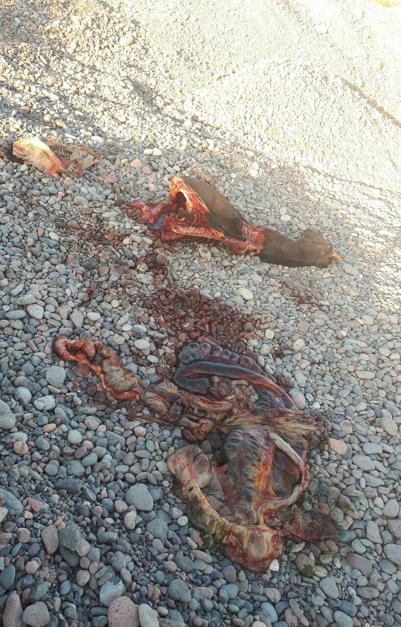 Según informaron las fuentes, hace unos cuatro días atrás, un grupo de hombres que trabaja en una ripiera ubicada al Norte de Mendoza y Centenario encontró las partes del animal (la cabeza y órganos) sobre una loma de una huella de ingreso y luego dieron aviso a la Policía.