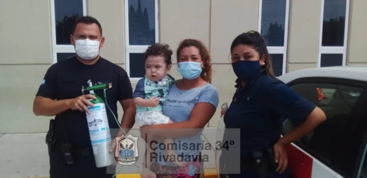 Según contaron, el cabo primero Mauro Martínez y la agente Yamila Cruz llegaron hasta un domicilio particular ubicado en el Lote Hogar N° 2, en La Bebida. Allí, María Rodríguez (25) les contó que su hijo de 2 años se estaba asfixiando tras obtruirse una cánula que posee por sufrir atresia de esófago de nacimiento y no le estaba ingresando un flujo normal de oxígeno.