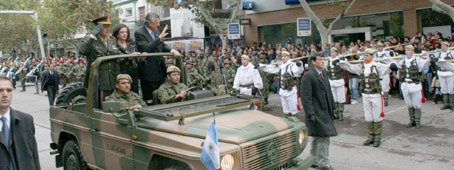 San Juan, 29 de mayo.- La ministra de Defensa, Nilda Garré, el gobernador José Luis Gioja y el jefe del Ejército, general Luis Pozzi, encabezaron hoy el acto central por el 199 aniversario de la fuerza, en el que participaron unos 800 militares. También estuvieron en el palco principal el comandante del Tercer Cuerpo del Ejército del Norte, general de división Carlos Pedro Artuso y el comandante de la Octava Brigada de Montaña brigadier general Toribio de Luzuriaga, general de Brigada Julio Cayetano Palagatti.