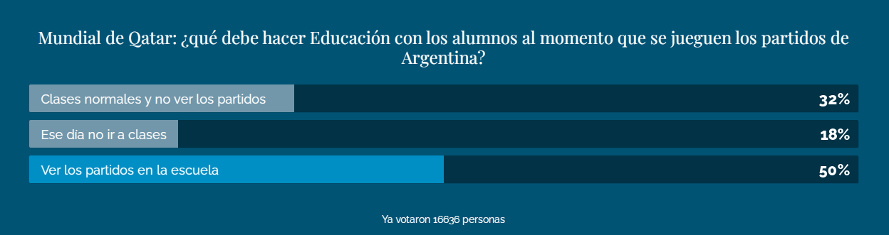"Mundial de Qatar: ¿qué debe hacer Educación con los alumnos al momento que se jueguen los partidos de Argentina?", fue la pregunta que se hizo a través de la encuesta en la que participaron 16.636 personas. De ellas, la mayoría, correspondiente al 50 por ciento, eligió la opción "ver los partidos en la escuela".