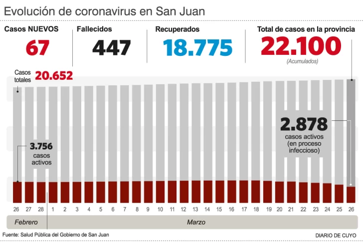Dos mujeres, una de 90 años y otra de 72, murieron a causa de Covid y los decesos suman 447. A su vez, detectaron 67 nuevos casos y el acumulado alcanzó 22.100, en tanto que los internados son 64.