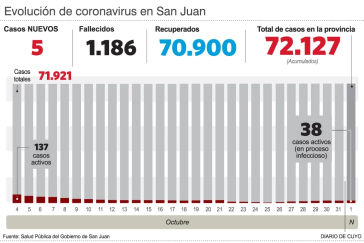 Una mujer de 76 años, de Rivadavia, murió por covid y de acuerdo a Salud Pública los decesos en pandemia suman 1.186 víctimas. Hacía 11 días que no eran reportadas nuevas muertes. A su vez, hubo 5 casos y el acumulado ahora tiene 72.127 infectados, en tanto que los casos activos son 38. Hay 40 personas internadas, de las cuales 12 permanecen en área crítica.