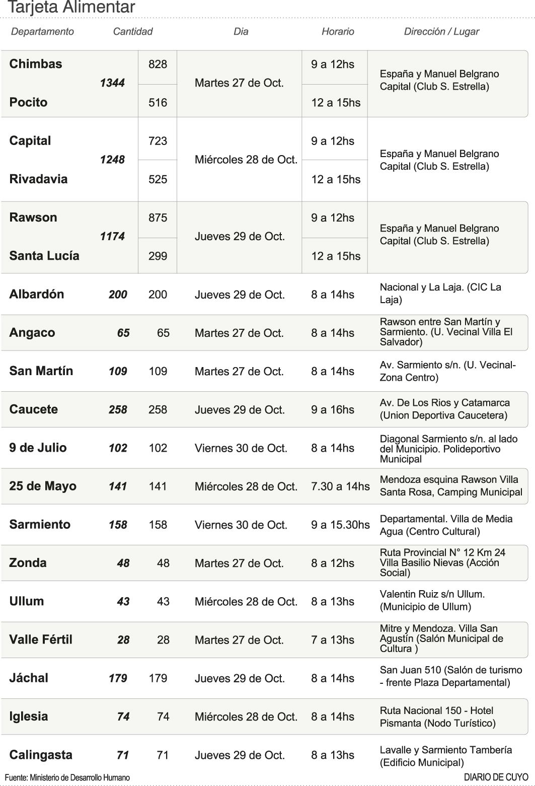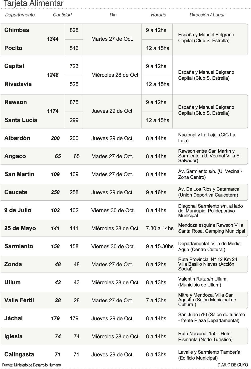 "A esos nuevos beneficiarios les vamos a entregar la tarjeta la semana que viene, a partir del martes, en distintos puntos de la provincia", dijo el funcionario. En esa línea, indicó que, por la situación sanitaria de la provincia, se tomarán todos los recaudos correspondientes en materia de distanciamiento para que se cumplan los protocolos del Comité Covid-19. Además, resaltó que, originalmente, la entrega la realizaba el Banco Nación, pero por la emergencia sanitaria, "es muy probable que la entidad no tenga el recurso humano para hacerlo. Por eso, se firmó un convenio para que podamos hacer la entrega". Además, Desarrollo Humano firmó un convenio con los municipios de los departamentos alejados para que ellos realicen el reparto de los plásticos. Así, la cartera social hará la distribución para Capital, Chimbas, Rawson, Santa Lucía, Rivadavia y Pocito en el club Sporting Estrella, sobre calle España y Belgrano, en Capital. El resto, en los lugares definidos por cada comuna (ver infografía).