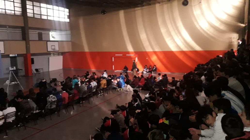 Los alumnos aprovecharon las tribunas del polideportivo para ver el partido en la pantalla gigante.