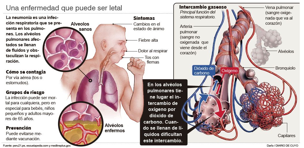 La vacunación contra neumococo tiene como propósito reducir la incidencia, complicaciones, secuelas y mortalidad por neumonía. Las personas de riesgo son los menores de 2 años, los adultos mayores de 65 años y las personas que tienen otras patologías. Según la Sadi, las personas que más padecen esta enfermedad son los mayores de 65. Desde esta entidad dijeron que en el país hay por año más de 150 mil adultos que padecen neumonía. A la vez, agregaron que según estudios realizados por ellos, 2 de cada 3 pacientes (66%) con esta enfermedad requieren internación hospitalaria. Por otra parte, explicaron que según esa investigación la mortalidad a los 14 días de contagiada la enfermedad fue del 19%; mientras que al año de haber tenido neumonía, ascendió al 38%.