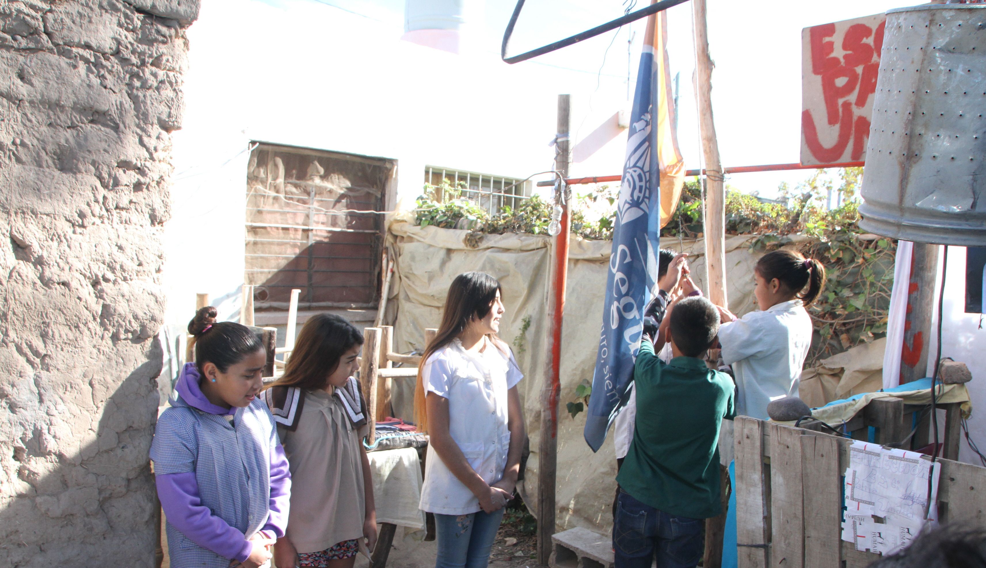La escuela funciona en tres turnos de 2 horas cada uno (de 14 a 16; de 16 a 18 y de 18 a 20). Antes de comenzar las clases, los alumnos y los docentes, que son todos niños, entonan el Himno Nacional Argentino o alguna otra oración a la bandera. Izan la celeste y blanca y saluda a todos los maestros. Es que además de Nico hay otras chicas del barrio que ayudan en el rol de docentes.