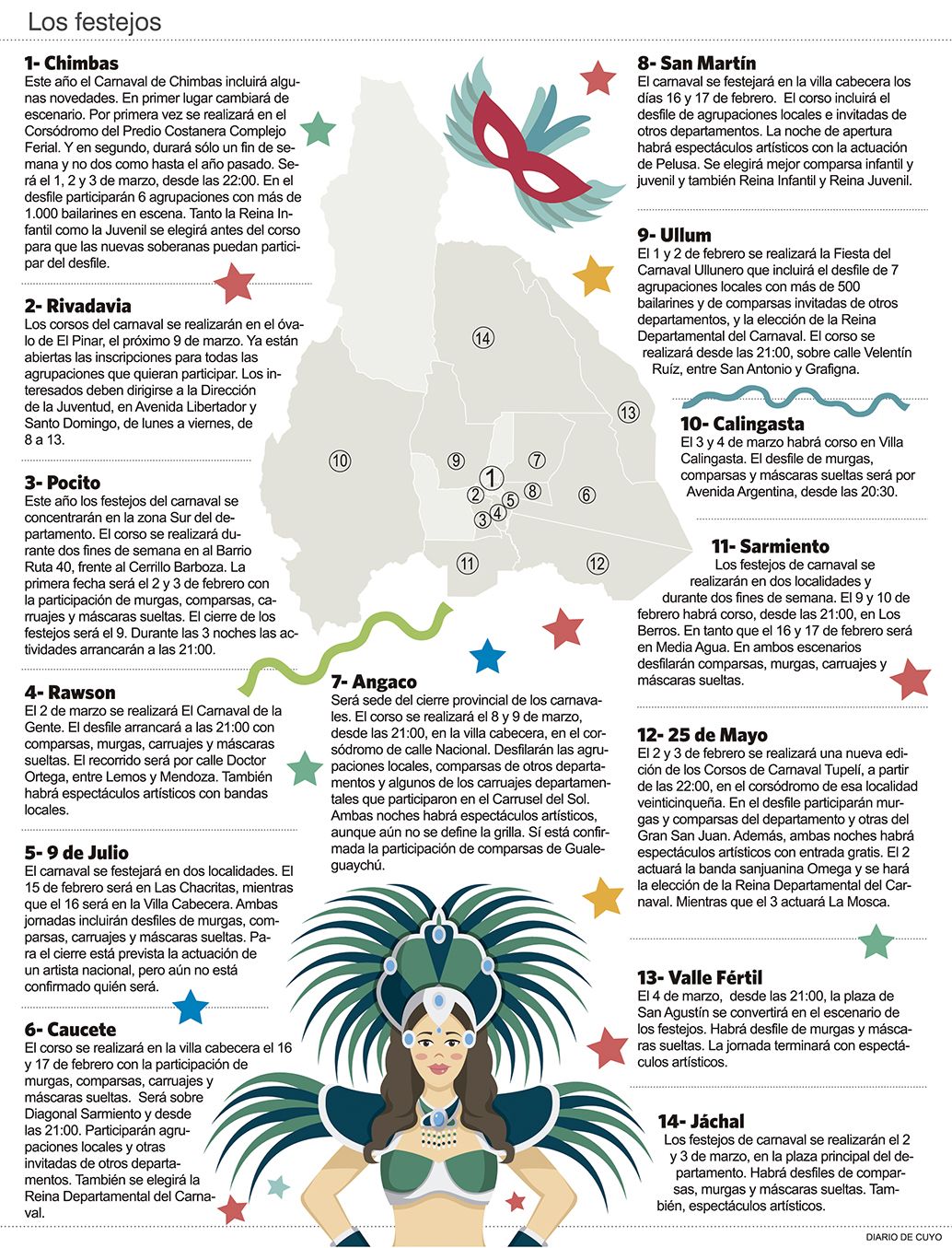 • 14  Son los departamentos que ya tienen definida la fecha en que realizarán los corsos para festejar el carnaval. En algunos festejos actuarán artistas nacionales gratis para la gente.