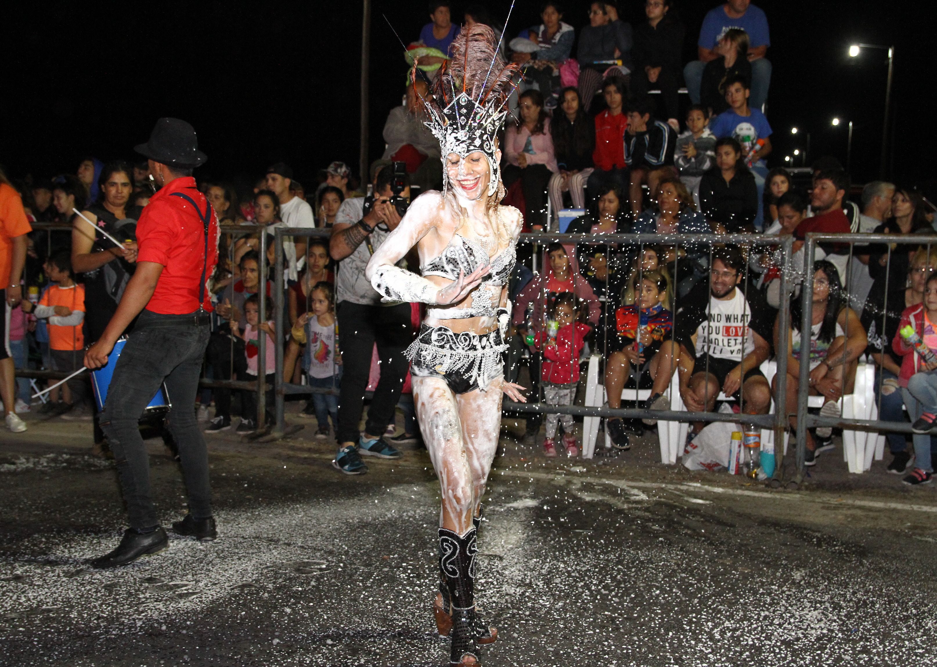 Era noche de carnaval y, especialmente los niños, los "ataques" con espuma eran una constante. Hasta el intendente departamental, Cristian Andino, tomó la precaución de guardar en una bolsa su celular, sabiendo del riesgo en una celebración que ya acumula 16 temporadas.