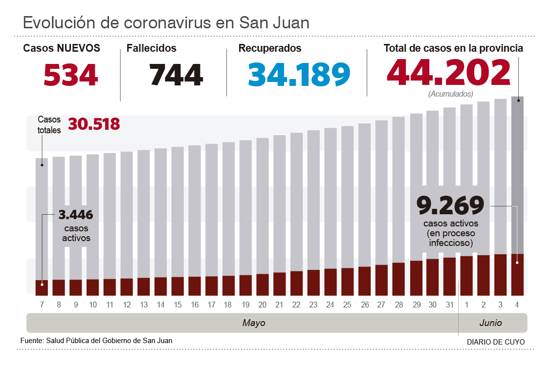 Por otro lado, nuevamente hubo una disminución en la cantidad de casos detectados. Ayer fueron 534 y de esta manera el acumulado es de 44.202 infectados. De ellos, hay 9.269 casos activos, es decir, tienen infección en curso.