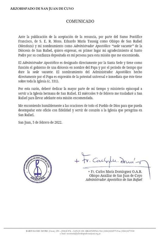 En el comunicado, el obispo auxiliar fue designado por el Sumo Pontífice para realizar tareas pastorales en la vecina provincia. Además, detalló que la semana que viene, más precisamente el 9 de febrero, viajará a San Rafael para llevar adelante "la misión encomendada".
