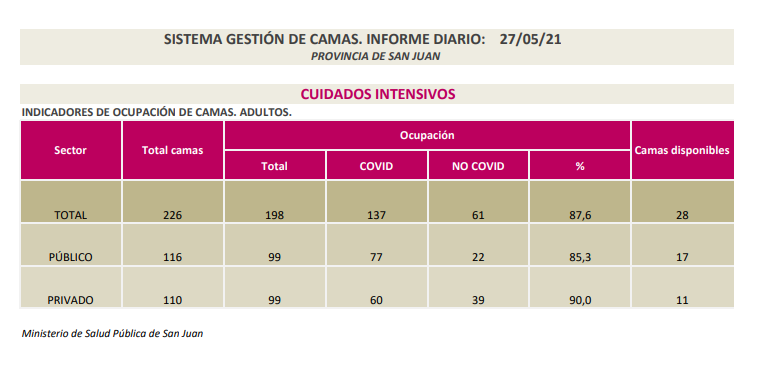 Se encuentran internados 297 pacientes en las áreas de COVID-19 (entre positivos y sospechosos) de los hospitales Dr. Guillermo Rawson; Dr. Marcial Quiroga; Dr. Ventura Lloveras, de Sarmiento; Dr. César Aguilar, de Caucete; Dr. José Giordano, de Albardón; Dr. Federico Cantoni, de Pocito; CEMEC; Dra. Julieta Lanteri; Hospital San Roque, de Jáchal; Hospital Dr. Alejandro Albarracín, de Valle Fértil; Hospital de Barreal, de Calingasta; Hospital Privado; Instituto Médico; Clínica El Castaño; Clínica Santa Clara; Sanatorio San Juan y CCI.