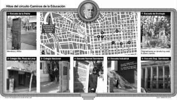 “Camino de la educación” es el nombre de la ruta que se ofrecerá a los turistas a partir de las próximas semanas, para que conozcan cómo Sarmiento implementó sus ideas fundando escuelas en su tierra natal. La ruta, que partirá desde la Casa de Sarmiento, pasará por 7 espacios en los que hay o hubo colegios y finalizará en la Escuela de Enología, con degustación incluida. Cada una de estas paradas es un Hito Histórico determinado en un proyecto de la Municipalidad de la Capital. Estos vienen siendo marcados con cartelería especial desde 2008, dentro de la Fiesta de la Educación. Y hoy, desde las 10, inaugurarán los 2 últimos espacios del recorrido con un acto en la plaza Laprida.