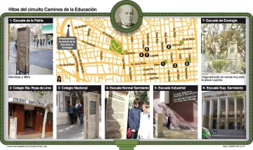 “Camino de la educación” es el nombre de la ruta que se ofrecerá a los turistas a partir de las próximas semanas, para que conozcan cómo Sarmiento implementó sus ideas fundando escuelas en su tierra natal. La ruta, que partirá desde la Casa de Sarmiento, pasará por 7 espacios en los que hay o hubo colegios y finalizará en la Escuela de Enología, con degustación incluida. Cada una de estas paradas es un Hito Histórico determinado en un proyecto de la Municipalidad de la Capital. Estos vienen siendo marcados con cartelería especial desde 2008, dentro de la Fiesta de la Educación. Y hoy, desde las 10, inaugurarán los 2 últimos espacios del recorrido con un acto en la plaza Laprida.