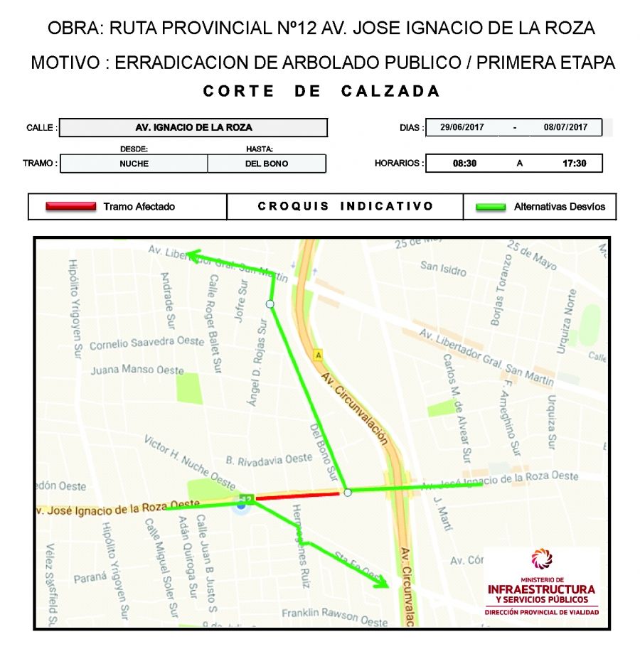 Desde el 29 de junio al 8 de julio, la Avenida Ignacio de la Roza presentará cortes programados en el tramo comprendido entre calles Nuche y Del Bono, para poder cortar y erradicar los árboles de la zona.