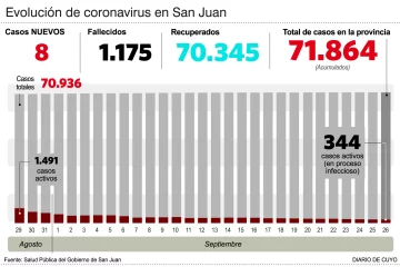 En el reporte de ayer, el Ministerio de Salud Pública de la provincia informó que se reportaron 8 nuevos casos de coronavirus y una muerte (una mujer de 63 años, oriunda de Capital, quien permanecía internada en la Clínica Santa Clara). A la fecha, San Juan acumula 71.864 contagios y 1.175 fallecidos; mientras que 344 atraviesan el proceso infeccioso.