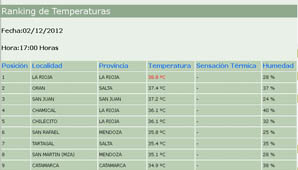 San Juan, 2 de diciembre.- Estaba pronosticada una máxima de 34º para la jornada de hoy con el cielo algo nublado y vientos leves del sector sur, pero una ola de calor afecta no solo la provincia sino al resto del país. San Juan se encuentra entre las tres provincias más calurosas de la Argentina con una temperatura sofocante de 37,2 grados. La máxima en el país se registra en La Rioja, con 38 grados.