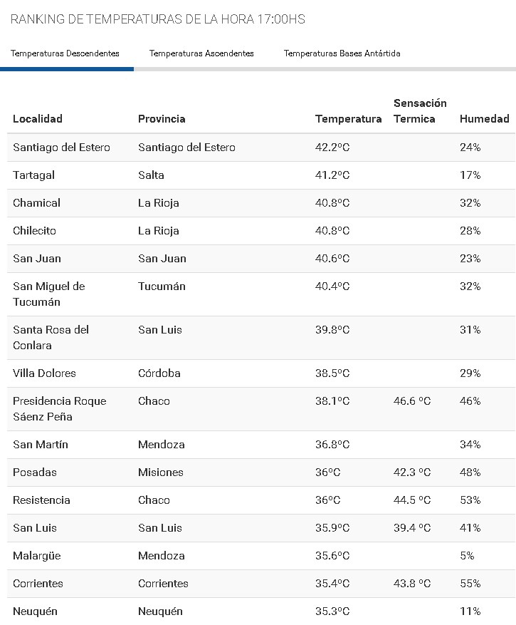 Según el Servicio Meteorológico Nacional, a las 17 San Juan alcanzó el quinto puesto del ranking nacional con 40,6 grados y un 23% de humedad. Santiago del Estero encabezó el listado, seguida de la ciudad salteña de Tartagal y las riojanas de Chamical y Chilecito.
