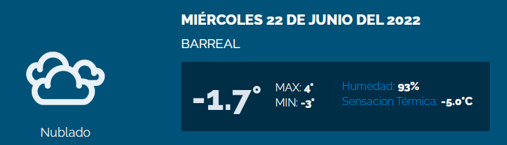Calingasta, y puntualmente Barreal, fue el más frío, con una temperatura de -1,7 grados y una sensación térmica de -7 grados.