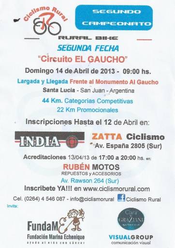 San Juan, 12 de Abril.- Este domingo desde las 9, frente al monumento al Gaucho en Santa Lucia, se realizará la segunda fecha del “Circuito El Gaucho”, competencia que organiza Ciclismo Rural, con el aval de la Federación Sanjuanina de Mountain Bike.