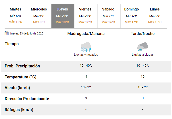 Mientras que, sobre la temperatura, indicó que habrá poca amplitud térmica debido al impacto de la nubosidad. Como consecuencia, para los tres próximos días se espera mínimas rozando los 0 grados y máximas que no superarán los 10 grados.