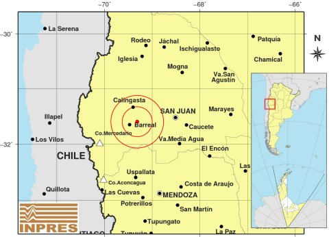 El epicentro se ubicó 77 kilómetros al Oeste de San Juan; 148 kilómetros al Norte de Mendoza; y 16 kilómetros al Este de Barreal, en Calingasta.