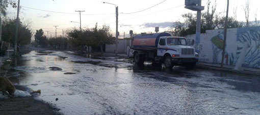 San Juan, 17 de junio.- Son más de 4 cuadras repletas de agua. Es que cerca de las 5 de la madrugada se rompió un caño matriz, de menores dimensiones al dañado el fin de semana y que dejó sin agua a parte de Rivadavia y Capital, en la intersección de calles República del Líbano y Lemos, en Rawson.
