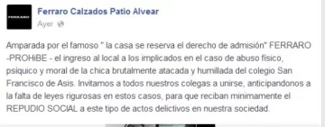 “Amparada por el famoso " la casa se reserva el derecho de admisión" FERRARO -PROHiBE – el ingreso al local a los implicados en el caso de abuso físico, psíquico y moral de la chica brutalmente atacada y humillada del colegio San Francisco de Asis. Invitamos a todos nuestros colegas a unirse, anticipándonos a la falta de leyes rigurosas en estos casos, para que reciban mínimamente el REPUDIO SOCIAL a este tipo de actos delictivos en nuestra sociedad”, escribieron en la red social.