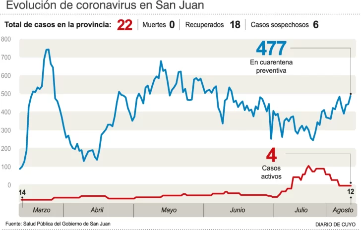 En cuanto a los individuos que están con el proceso infeccioso, se mantienen hasta ahora sin síntomas, a la vez que por ello se encuentran aislados en diferentes hoteles de la provincia. En tanto, Salud Pública indicó que sigue figurando un caso de Covid-19 en el informe de Nación, pero que se trata de un sanjuanino que vive en otra provincia y no realizó el cambio de domicilio, por lo que pidieron la reclasificación.