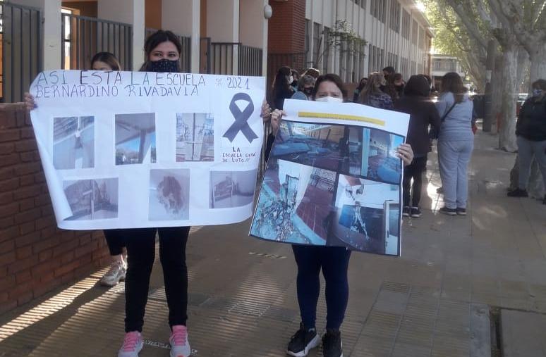 Un grupo de padres de la Escuela Rivadavia se manifestó esta mañana en la puerta de la institución exigiendo que el histórico edificio sea puesto en condiciones tras los serios daños que sufrió en el último terremoto de enero.