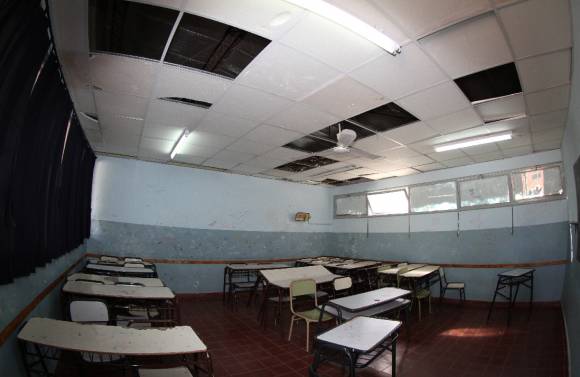 El hombre señaló que “los directivos hacen todo lo posible” para que los docentes puedan continuar con el dictado de clases pero es “imposible” debido a que los sobretechos se caen a pedazos, no hay calefacción, ni ventilación. Además, los baños casi siempre están inutilizables debido a que no hay agua, por lo que deben usar baldes de emergencia en algunos casos.