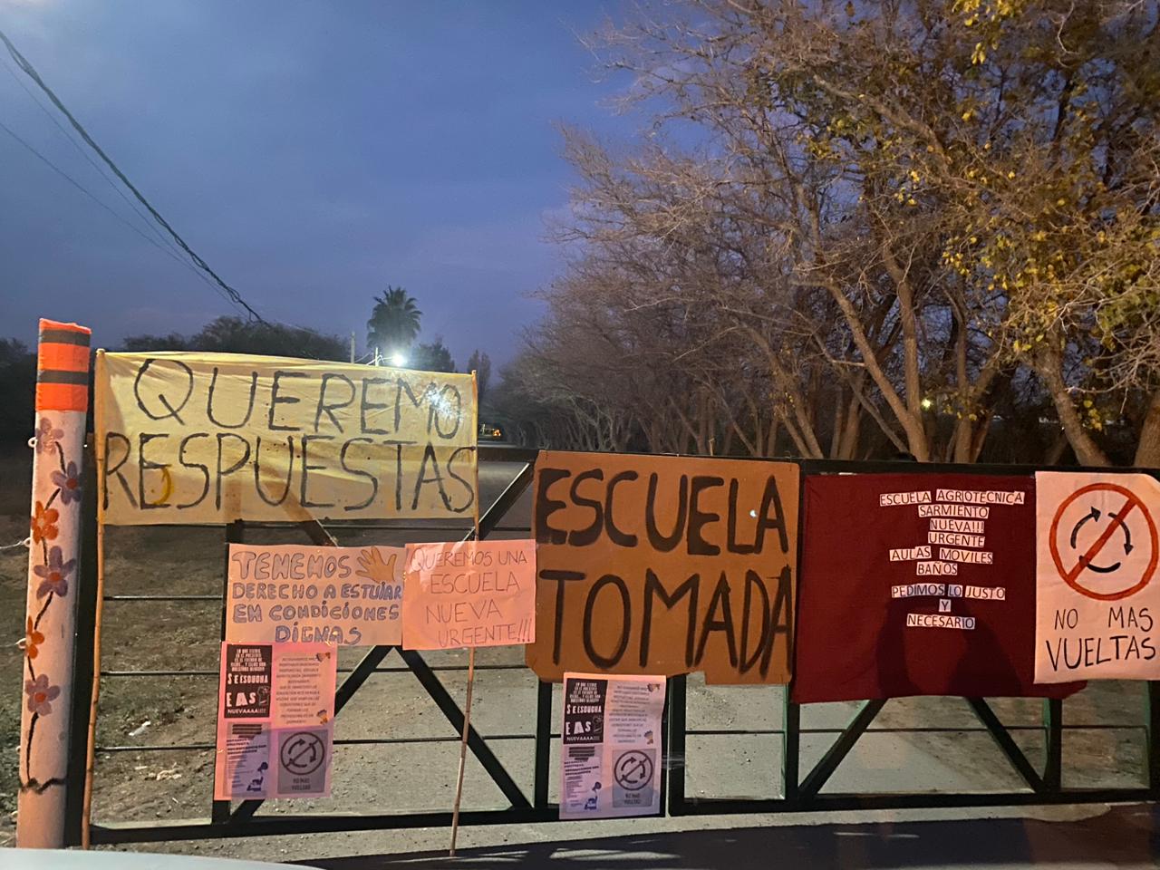 Este lunes, cuando todavía no amanecía, padres de los alumnos de la Escuela Agroténica de Sarmiento llegaron a la institución, colgaron carteles en los ponemos e iniciaron una toma en reclamo de mejoras para sus hijos. Según afirman, los chicos toman clases hacinados, por turnos o a la intemperie.