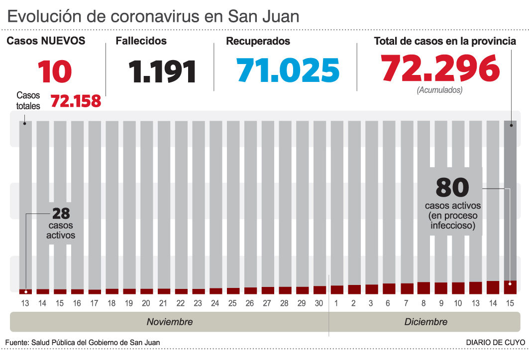 Por su parte, todo noviembre sumó 91 infectados y por primera vez en 16 meses de pandemia San Juan había cerrado un balance mensual con menos de 100 casos. Pero ahora, con los 83 contagios en una quincena y un promedio de más de 5 positivos diarios, quedó al borde de alcanzar aquella cifra.