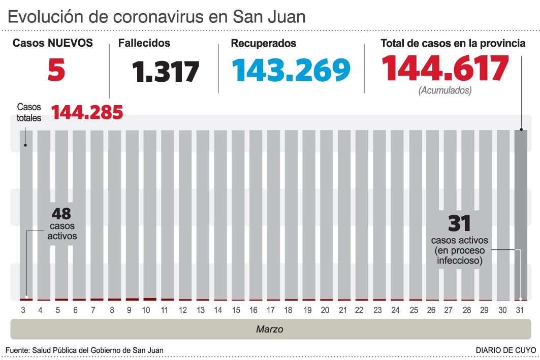 Si bien la pandemia demostró que cualquier cosa puede suceder y de un momento a otro, esta vez todo parece indicar que lo peor ya ha pasado. Y por ahora las estadísticas son un buen aliado para pensar que el impacto del covid finalmente va quedando atrás. Sucede que marzo cerró ayer con 397 casos de covid y confirmó la fuerte contracción en la curva de contagios que registra la provincia tras el pico de enero. Se trata del cuarto mes con menos casos desde agosto de 2020, que básicamente es cuando San Juan empezó a vivir la pandemia.