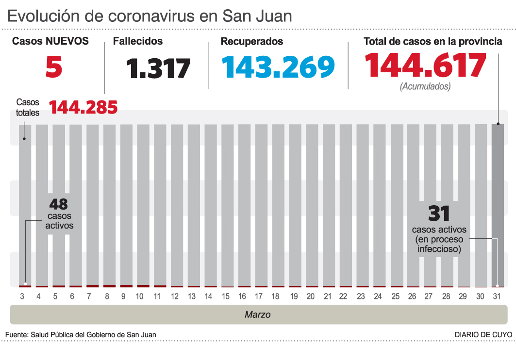 El parte de Salud Pública ayer informó que fueron detectados 5 casos positivos en 460 test realizados en toda la provincia. De esta manera, el acumulado tiene 144.617 infectados en pandemia. Los casos activos son 31, a la vez que los pacientes internados ahora son cuatro. Dos están en área crítica, pero sin asistencia respiratoria mecánica. Los recuperados ya son 143.269.