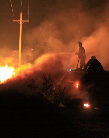 Cerca de las 20 del jueves, cuando el fuego ya había consumido entre 18 y 20 hectáreas y se reavivaban focos en distintos puntos, algunos cerca del cerro y otros más cerca de la Ruta 12, una autobomba de Bomberos llegó y avanzó de inmediato en una de las calles internas del parque, para intentar detener el fuego. Poco pudieron hacer, porque las llamas ya habían alcanzado los extensos totorales e incluso el tendido eléctrico que atraviesa esos campos. Las chispas de los cables incendiándose eran uno de los peligros que los Bomberos debían sortear, mientras luchaban en medio del humo y la oscuridad. Así siguieron hasta pasada la 1 de ayer, cuando los focos estaban casi todos bajo control y el fuego detuvo finalmente su avance, frenado por la Ruta 12, que separa al Parque Sarmiento de la zona urbanizada de Zonda.