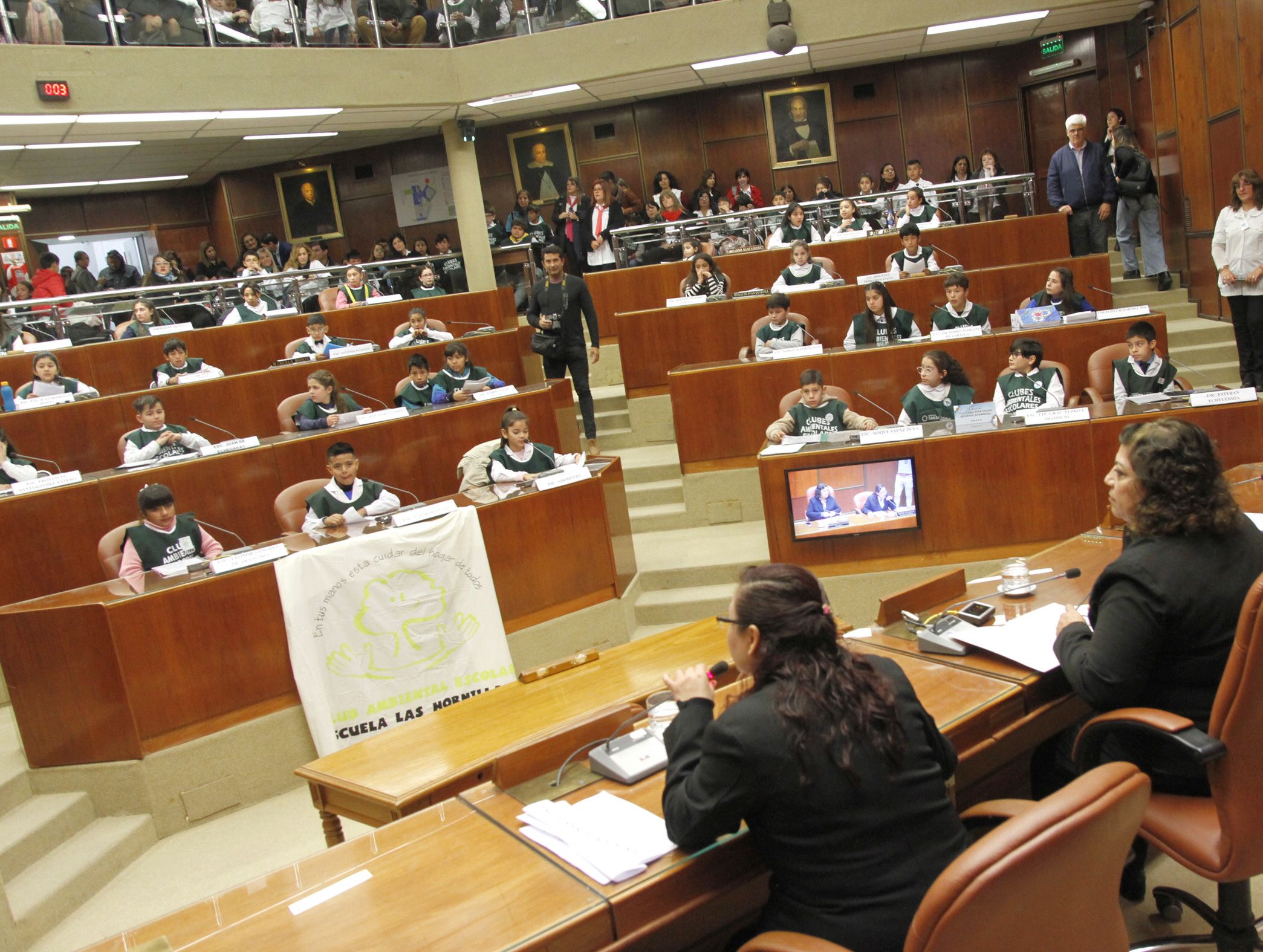 A las 9 de las mañana, los chicos expositores ocuparon su lugar en el recinto, esperando su turno para hablar. Aprovecharon la previa para entretenerse levantando la mano para visualizarse en la pantalla gigante que tenían en frente o para releer una y otra vez lo escrito sobre el proyecto desarrollado en la escuela y que luego compartirían con todos los presentes. Este momento llegó tras el mensaje de bienvenida al VIII Parlamento de Clubes Ambientales que les dio Francisco Guevara, secretario de Ambiente, y de agradecerles por el compromiso con el que trabajan.