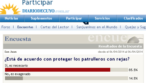San Juan, 7 de abril.- Luego de que DIARIO DE CUYO publicara una nota sobre las nuevas protecciones de metal para los patrulleros, diseñadas por el Comando Radioeléctrico, este medio realizó una encuesta en la que los lectores apoyaron ampliamente la iniciativa.