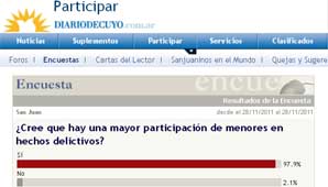 San Juan, 29 de noviembre.- Luego de que esta mañana Jorge Toro, titular de Niñez, Adolescencia y Familia, manifestara que “no hay un incremento de la participación de chicos en hechos delitos", DIARIO DE CUYO ONLINE, realizó una encuesta para que los lectores puedan expresar su punto de vista acerca del tema.