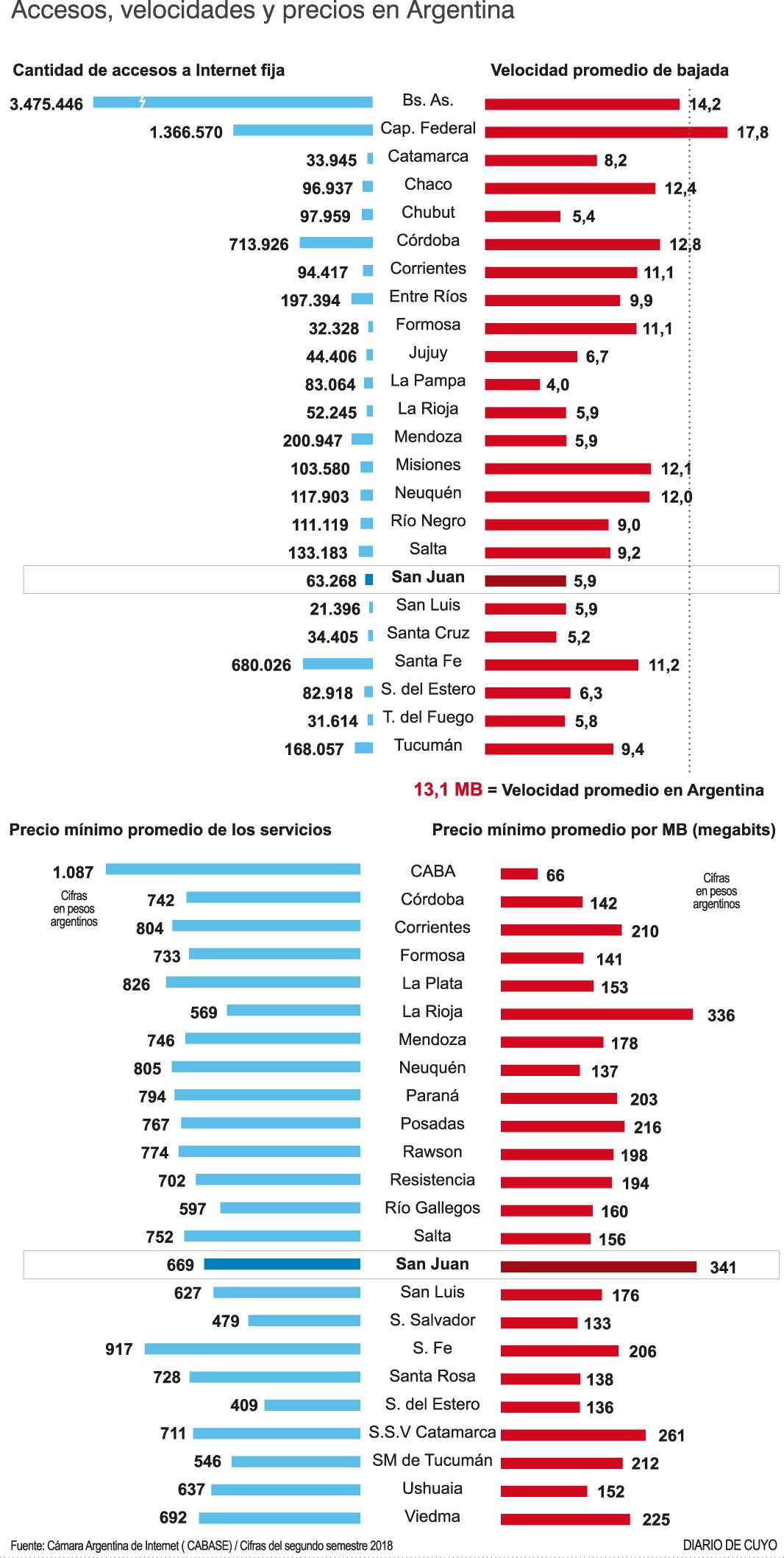 Por ejemplo en la velocidad de acceso, San Juan integra el 40% de los usuarios del país que "navegan" entre 1 y 6 MBPS (Megabytes por segundo), lejos del promedio nacional, que con 13,1 lo dobla en velocidad.