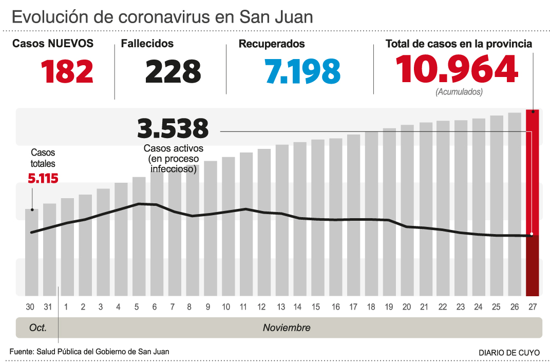 Con 182 nuevos infectados que hacen un total de 10.964 casos de coronavirus en San Juan, en el parte de Salud Pública se volvió a destacar la alta cifra de fallecidos con 7 muertes. Fallecieron una mujer de 56 años, de Rawson; un hombre de 71 años de Rivadavia y una mujer de 68 años de Rawson, los tres internados en el Hospital Rawson. También una mujer de 85 años de Capital, otra mujer de 76 años también de Capital y un hombre de 53 años, de Chimbas, internados en el Hospital Privado; por último pocitano de 85 años en el CCI.
