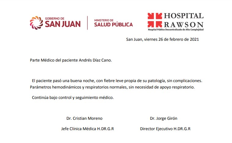 El parte indica que el paciente pasó una noche sin complicaciones, pero con fiebre propia de la patología que atraviesa. Los parámetros hemodinámicos y respiratorios son normales y continua sin asistencia respiratoria. Por último, el parte indica que Díaz Cano seguirá bajo control y seguimiento médico.