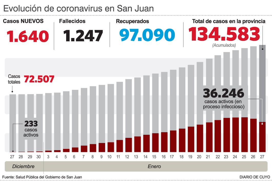 Tras un inicio de semana con más de 3.000 contagios de coronavirus todos los días, ayer Salud Pública informó menos de 1.700 casos nuevos en la jornada de ayer. Además, registraron dos muertes por covid en San Juan: una caucetera de 77 años y un vecino de Capital, de 69 años.