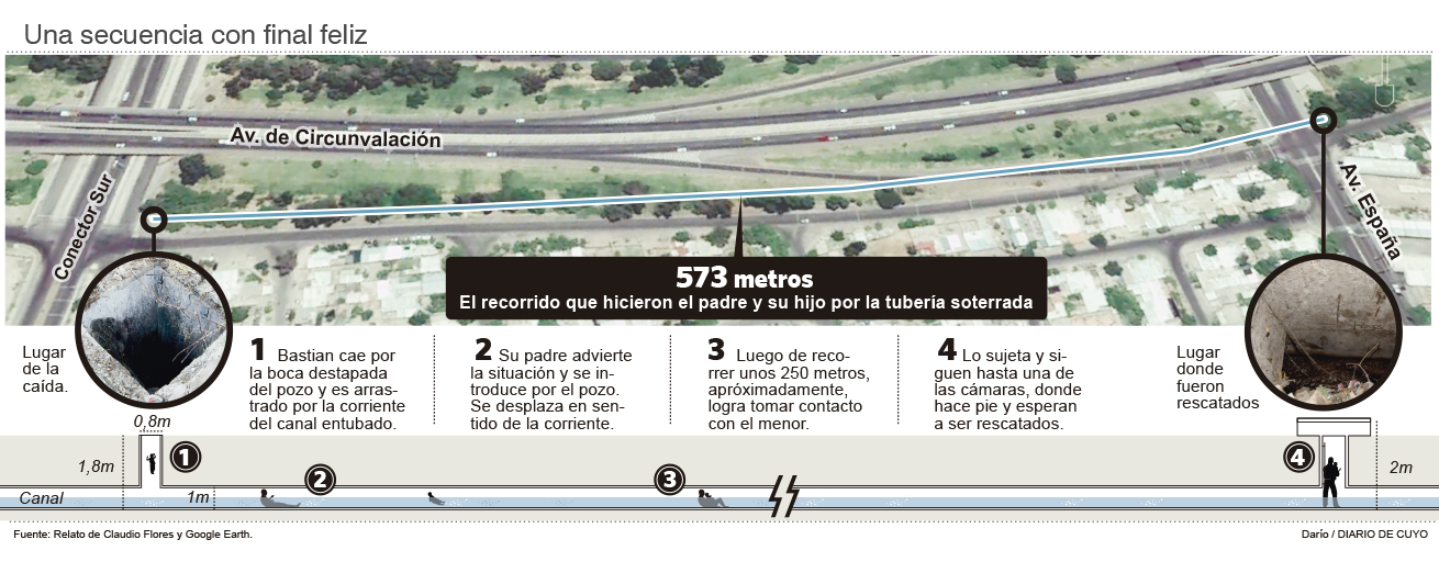 Adentro del canal, Claudio no veía nada. Sólo escuchaba el sonido del agua y los pedidos de auxilio de su hijo. Contó que a lo lejos oía que Bastian le gritaba: “Papi ayudame, llamá a la policía”. Eso le dio más fuerzas para seguir en busca de su nene. “Cuando me metí me dejé llevar por el agua, que corría fuertísimo. Me acordaba que me enseñaron a inflar los pulmones para flotar y eso hacía, no quería tocar el suelo con el cuerpo e iba derechito -acostado- para no frenarme y llegar a mi bebé. Yo le decía que me esperara que iba a ayudarlo y que no dejara de hablarme. Al principio lo escuchaba lejos, pero luego cada vez su voz se acercaba más y más. Hasta que en un momento lo toqué con el pie y como pude lo tomé con una de mis manos”, contó. En ese momento, en el que sólo habían pasado unos minutos, Claudio tomó a su hijo con una de sus manos. Lo abrazó contra su pecho, mientras que con la otra mano, la que tiene llena de quemaduras y raspones, intentó frenarse tomándose de las paredes. A los pocos metros, el hombre no supo calcular exactamente cuántos, vio una luz de otra boca de salida y se dio cuenta que ese era el momento de cambiar de estrategia para intentar salir de ahí. Cuando pasó por ese lugar, casi de inmediato y gracias a unos alambres logró quedar trabado en la boca que está en calle España, a más de 500 metros de donde cayeron. “Me puse de pie y no dejaba de abrazar a mi hijo. El agua iba tan rápido que me hacía temblar las piernas y yo trataba de mantenerme fuerte porque tenía la sensación que detrás de mí iba a venir mi señora a buscarnos. Rogaba que ella no se hubiera tirado como lo hice yo para buscarnos, porque fue horrible. Es mi hijo y aunque todos dicen que lo que hice es heroico, para mí no fue nada. Doy mi vida por él. Si no salía con él, no salía de ahí. Iba a ir hasta el fin del mundo buscándolo”, dijo con los ojos llenos de lágrimas y agregó que cuando abrieron la tapa, después de escucharlos gritar logró salir. Ahí, lo único que preguntaba es que si su esposa y su otro hijo estaban bien.