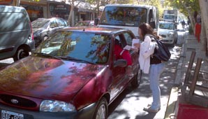 Decenas de chicos repartieron stickers en las esquinas de Mendoza y Rivadavia, y en Mitre y General Acha. Los conductores los pegaron en los vidrios de los vehículos.