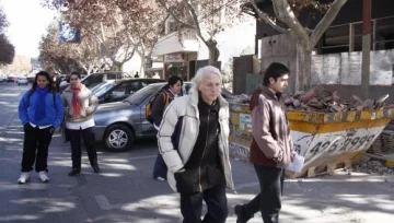 Cuidándose de no ser atropellados por los autos y de costado. Así caminan quienes recorren 6 cuadras específicas de pleno centro (ver infografía), ya que deben transitar por la calle. Es que en las veredas el paso está limitado por chapas y cintas, que han sido colocadas mientras se construye o repara edificios. El mayor inconveniente se da en horas pico, cuando la gente que camina es tanta que no puede pasar toda a la vez por el estrecho espacio que queda disponible.
