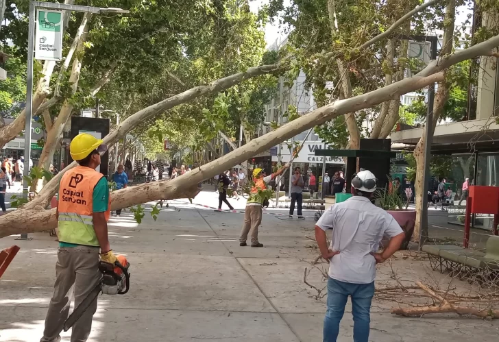 Durante la mañana de este viernes, un enorme árbol cayó en medio de la Peatonal, en la Capital sanjuanina. Aparentemente, fueron las ráfagas de viento Sur las que tiraron el plátano ubicado en sobre calle Tucumán y Rivadavia.