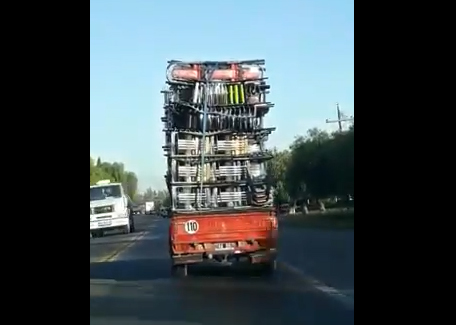 Una peligrosa situación se registró esta mañana en la ruta 20, cuando una camioneta circuló con una carga de sillas apiladas que alcanzaba una gran altura, al punto que casi triplicaba los metros de alto de la Peugeot 504.