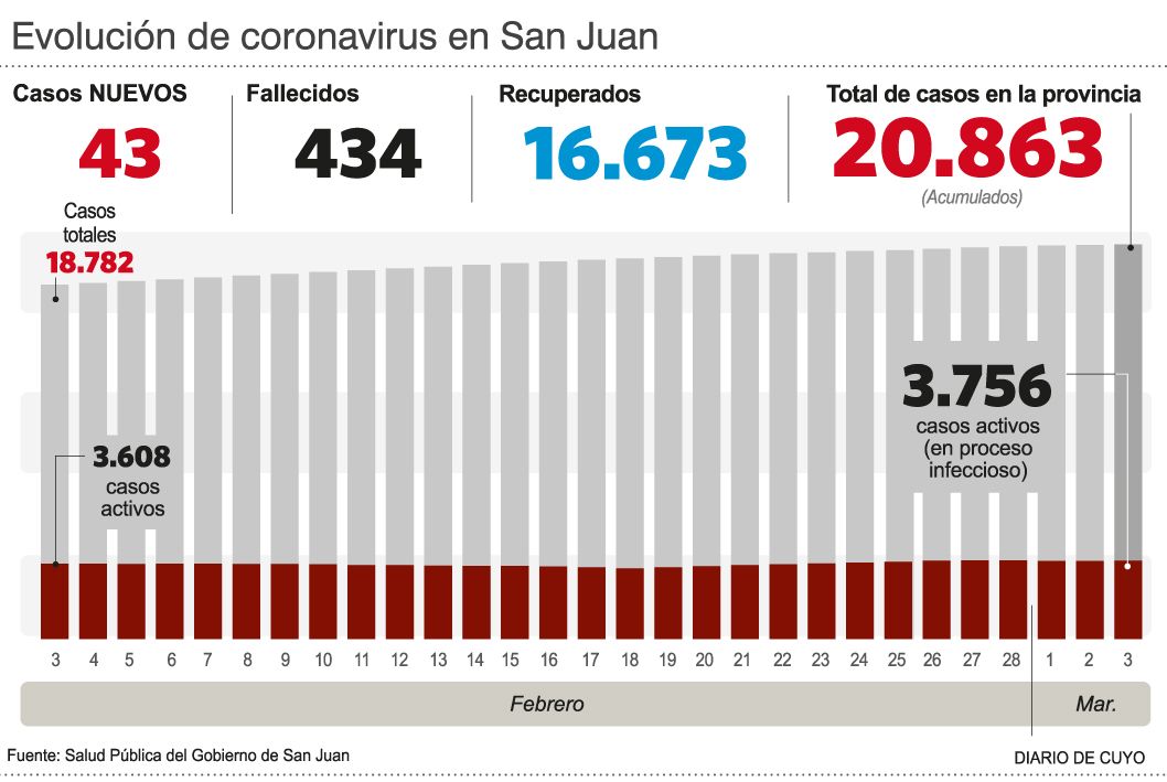 Salud Pública informó que hubo tres muertes a causa de Covid en las últimas 24 horas. Se trata de dos mujeres de 81 y 65 años y un hombre de 78, por lo que el total de fallecidos es de 434. Por su parte, detectaron 43 nuevos casos y el acumulado asciende a 20.863. Hay 31 internados en terapia intensiva (10 de ellos con asistencia respiratoria mecánica) y 16.673 recuperados.