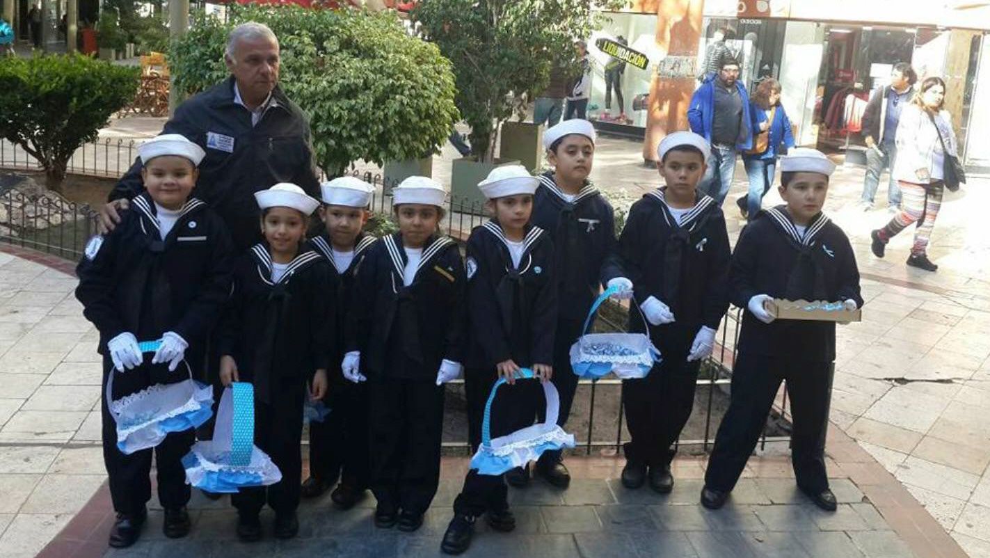 Ayer, los chicos de la Escuela de Marineritos, de la Agrupación Infantil Stella Maris, llegaron ayer hasta la peatonal céntrica para repartir escarapelas entre los peatones. Llamaron la atención de la gente por su vestimenta, especialmente la de los niños.