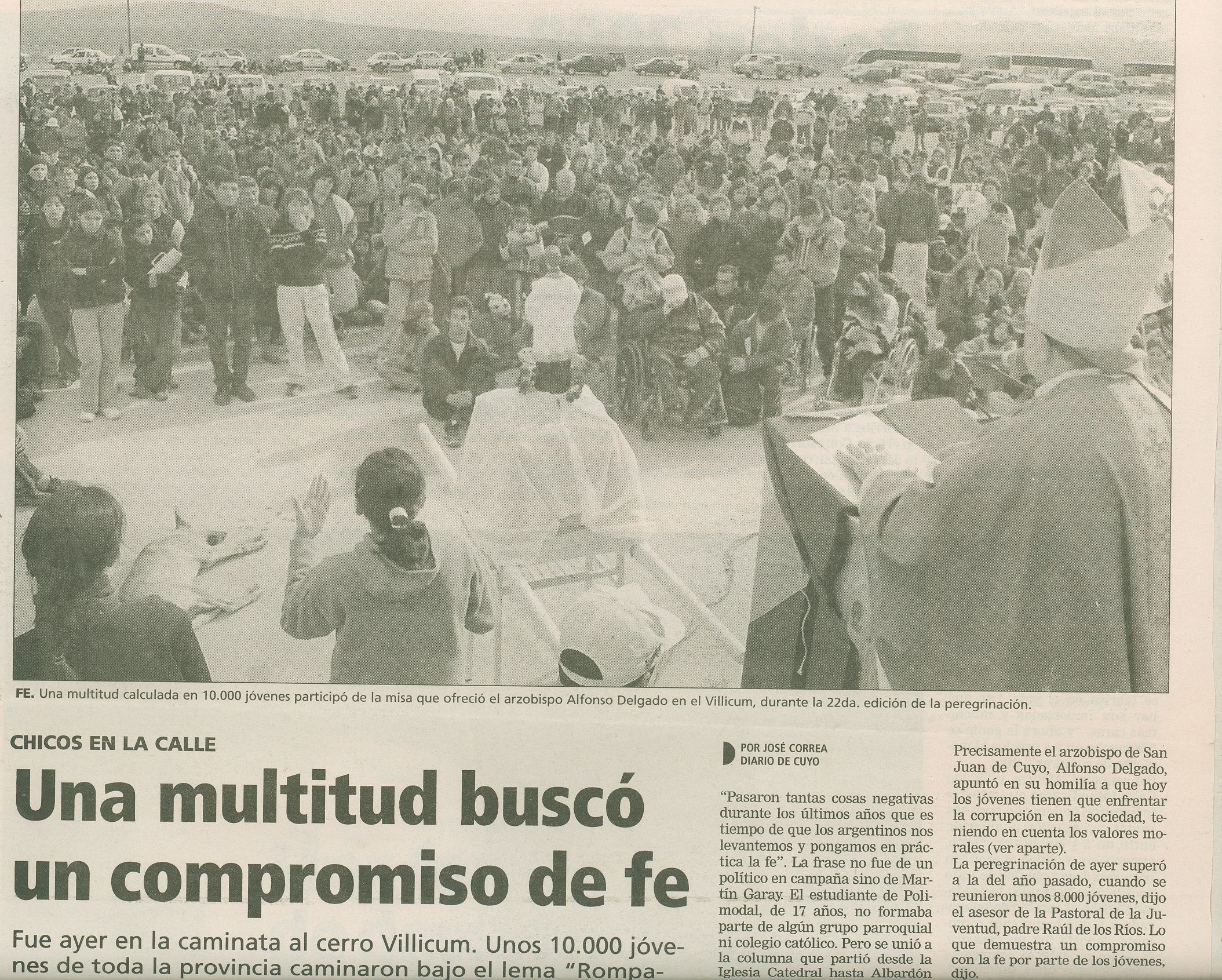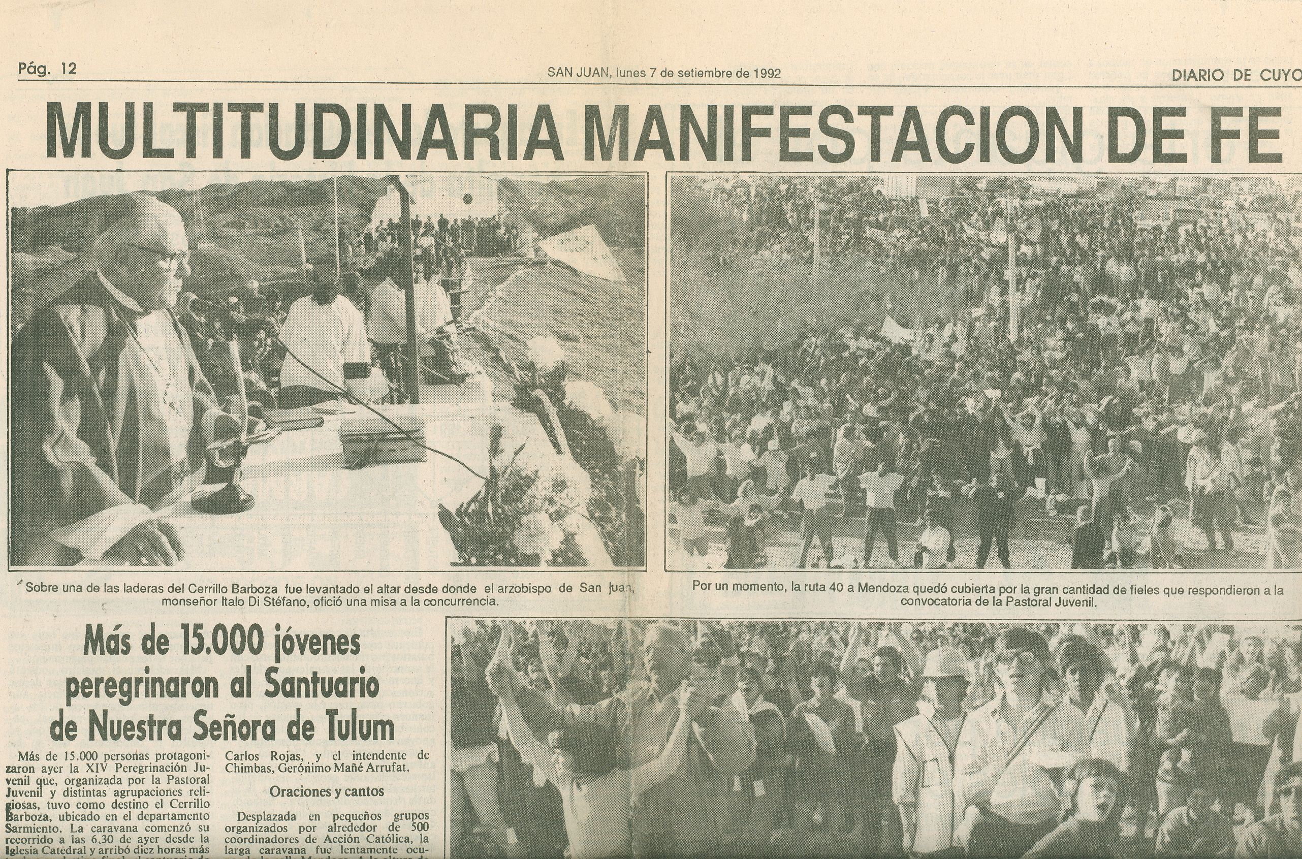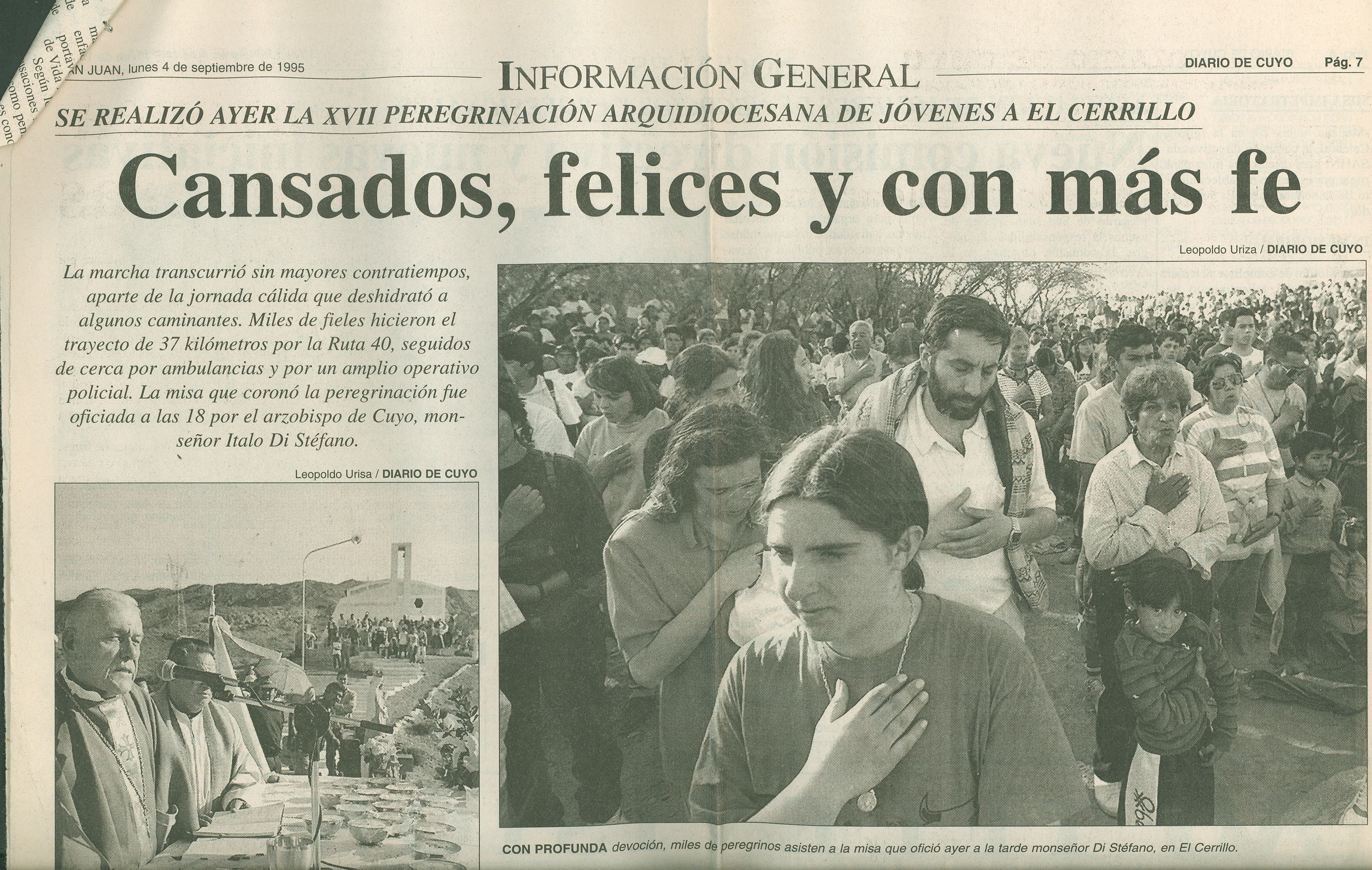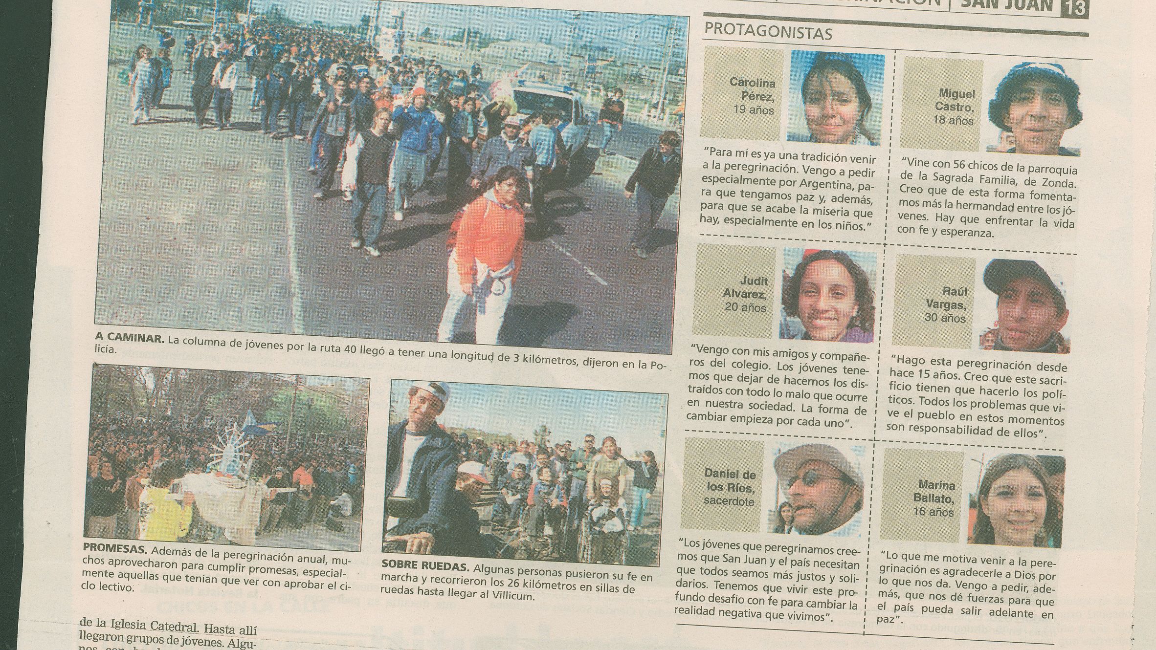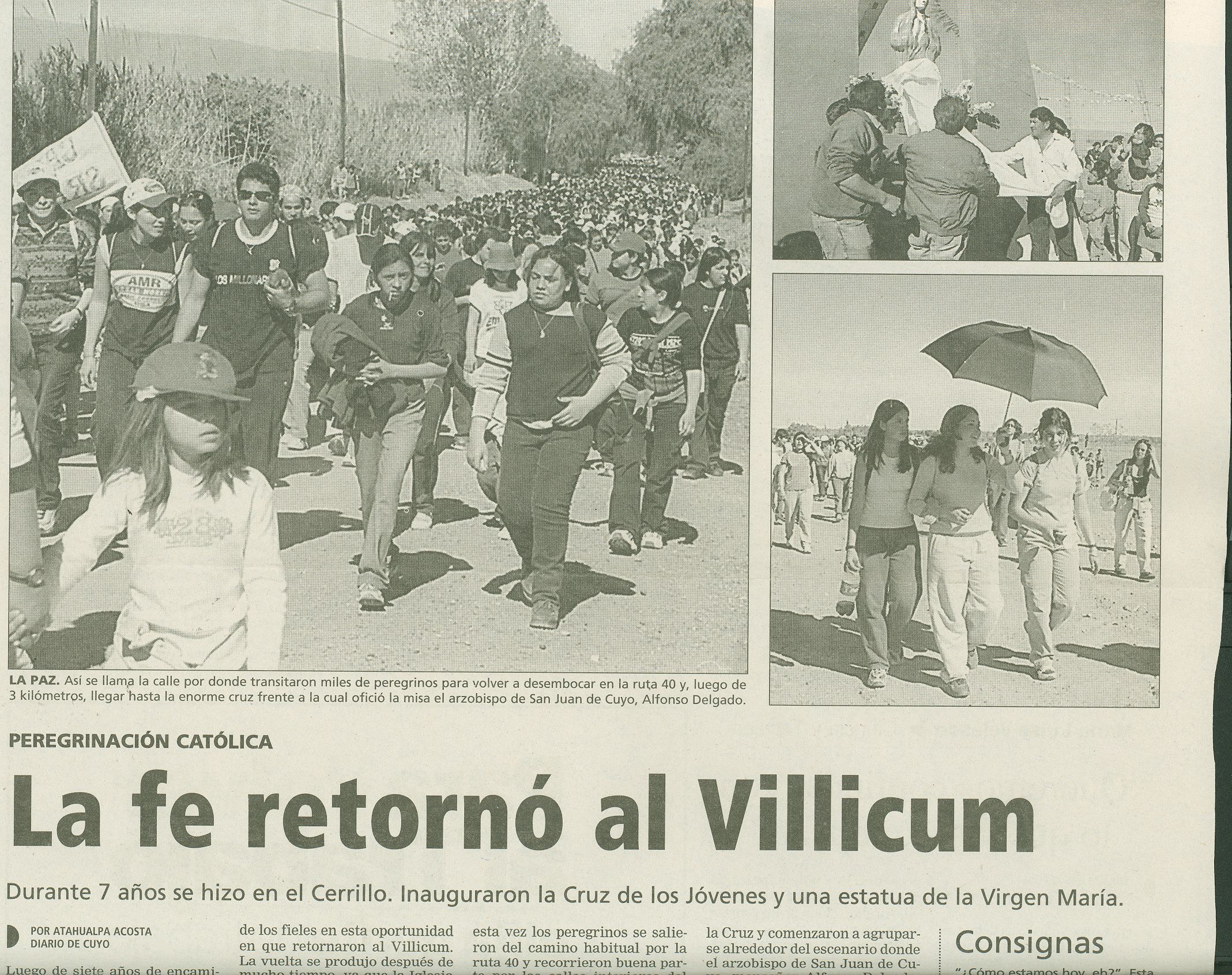 “Rostros enrojecidos por el calor y la fatiga, con los brazos casi inertes, las botellas vacías en las mochilas y sus pies palpitantes y ampollados, así llegaban al Cerrillo, dice la crónica de Diario de Cuyo del 4 de septiembre de 1995. El día anterior miles de personas habían recorrido 37 kilómetros desde la catedral hasta el cerro pocitano.